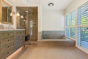 The designers and contractors for this project came to us with a specific challenge: they wanted to avoid removing the existing stone tile and mortar beneath it. With our seamless Micro Cement application, you’d never know there was tile underneath. The finished floor not only looks flawless but also enhances the sense of space, making the home appear even larger.